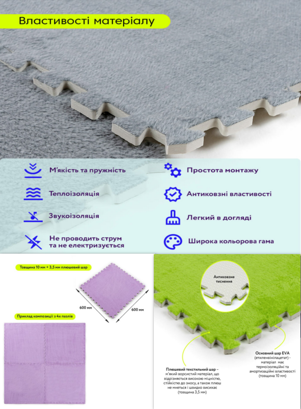 Насамперед такий килимок ідеально підійде в дитячу кімнату. Більше не потрібно буде переживати, що малюк впаде, адже килимок відмінно амортизує падіння, він м'який і приємний на дотик. На такому килимку малюк зможе проводити багато часу граючи і пізнаючи світ, адже він екологічний, дихаючий, не вбирає зайві запахи, дуже м'який і відмінно захищає від холодної підлоги.